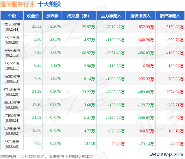个股表现方面,通信服务行业当日领跌股为普天科技(002544),该股当日报收23.32,下跌2.26%,成交量25.97万,主力资金净流出7012.27万元。*ST信通(600289)以下跌2.03%紧随其后,该股当日成交量14.57万,主力资金净流出1199.96万元。除此之外,三维通信(002115)、*ST亿通(300211)、恒实科技(300513)均进入当日熊股之列。具体个股列表见下表:
