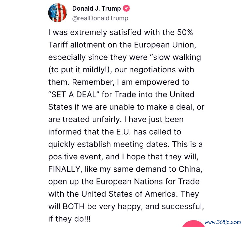 特朗普在社交媒体最新发文称:“我对向欧盟征收50%的关税表示非常满意,尤其是考虑到他们在与我们的谈判中一直‘拖拖拉拉’。请记住,如果我们无法达成协议或受到不公平对待,我有权为进入美国的贸易”设定条件“。我刚刚得知,欧盟已呼吁尽快确定会议日期。这是一个积极的信号。如果他们这样做,双方都会非常高兴并取得成功。”