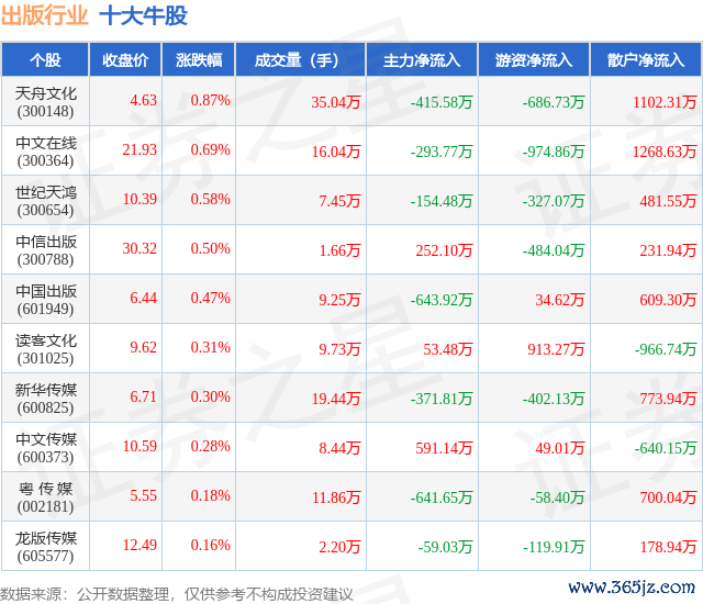 个股表现方面,出版行业当日领涨股为天舟文化(300148),该股当日报收4.63,上涨0.87%,成交量35.04万,主力资金净流出415.58万元。中文在线(300364)以上涨0.69%紧随其后,该股当日成交量16.04万,主力资金净流出293.77万元。除此之外,世纪天鸿(300654)、中信出版(300788)、中国出版(601949)均进入当日牛股之列。具体个股列表见下表: